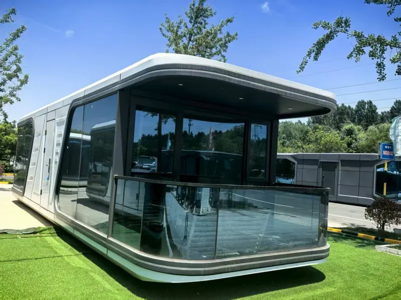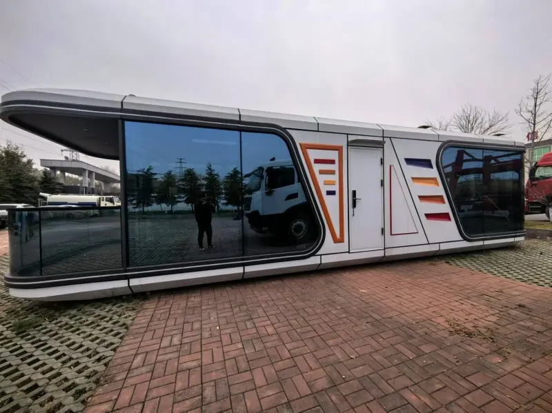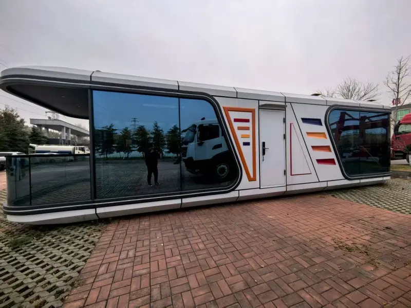 The RT-S70 space capsule has an exterior specification of 11.5m×3.3m×3.2m, featuring a super large space of 38m². It has a flexible layout of one bedroom, one living room, one bathroom and one balcony. With a total weight of only 9.2T, it is an extremely cost-effective choice. Its innovation lies in the external LED ambient lights, which can present various light and shadow effects at night, enhancing commercial appeal. The cabin is equipped with central air conditioning and integrated electric water heaters, featuring high energy efficiency. The combination of glass curtain walls and fireproof doors not only ensures lighting but also guarantees safety. The RT-S70 is suitable for use in market restaurants or temporary exhibition halls, combining functionality with visual impact.